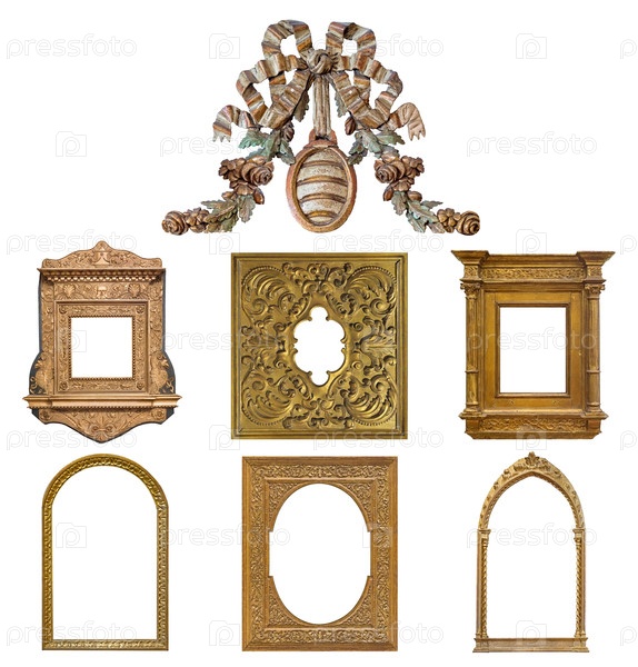 Набор золотых рамок для картин, зеркал или фотографий, изолированных на белом фоне