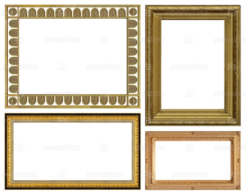 Набор золотых рамок для картин, зеркал или фотографий, изолированных на белом фоне