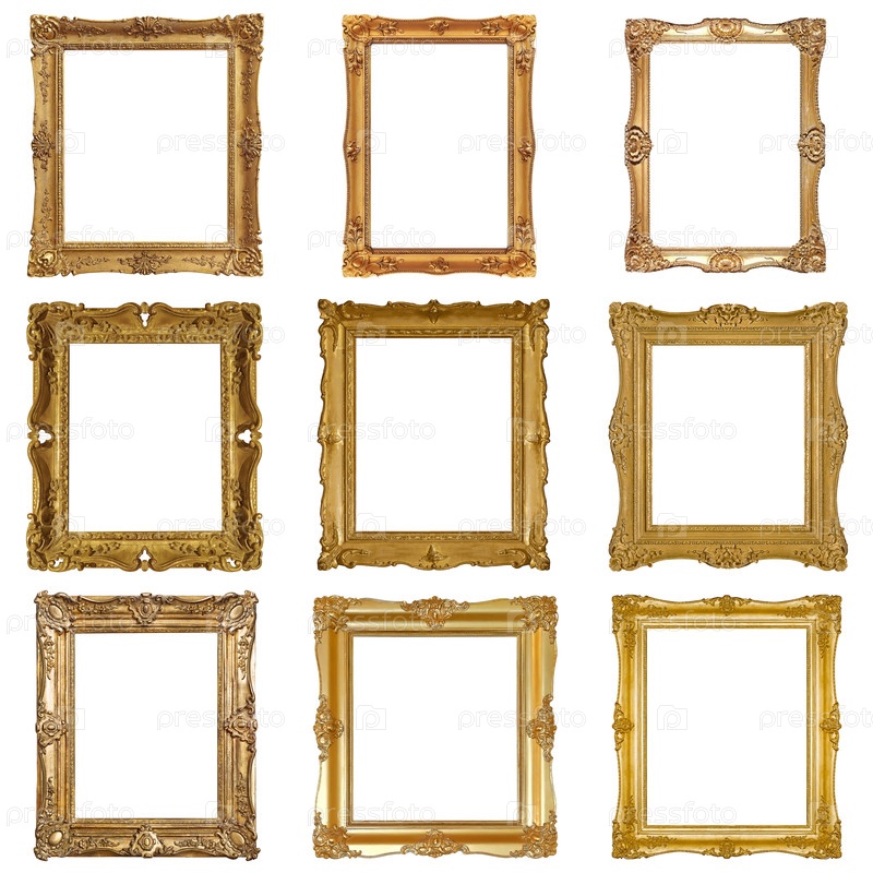 Набор золотых рамок для картин, зеркал или фотографий, изолированных на белом фоне