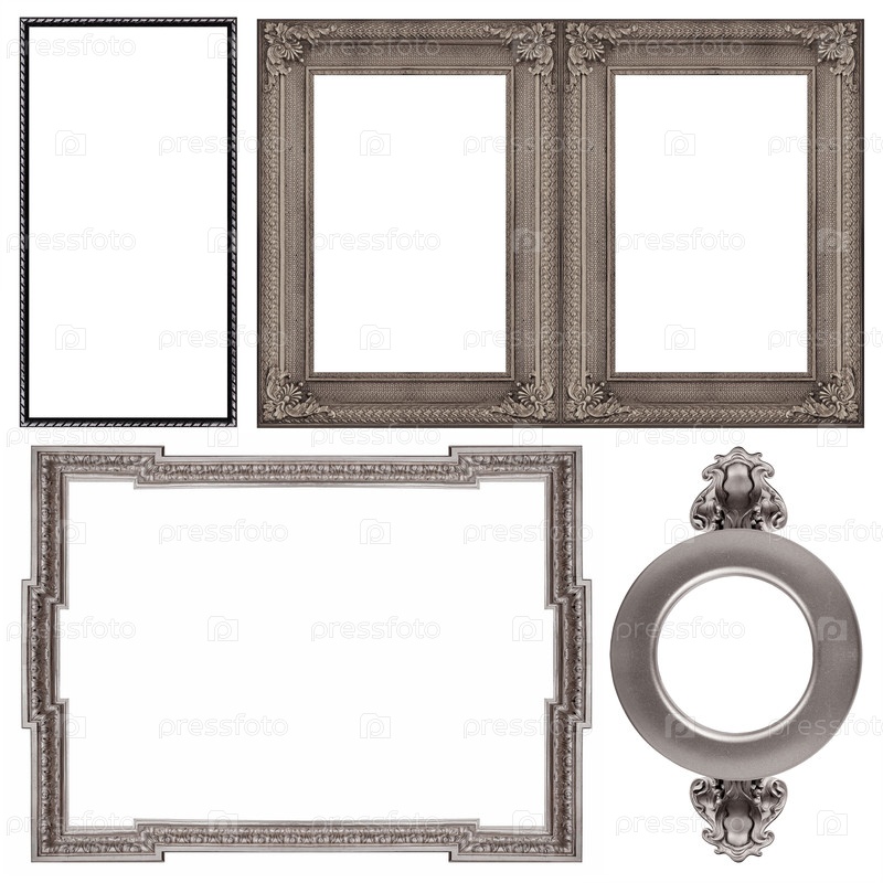 Набор серебряных рамок для картин, зеркал или фотографий изолированный на белом фоне
