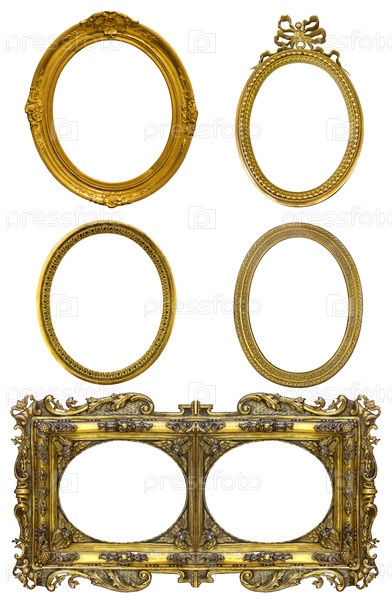 Набор золотых рамок для картин, зеркал или фотографий, изолированных на белом фоне