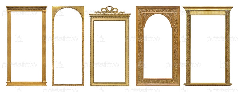 Набор золотых рамок для картин, зеркал или фотографий, изолированных на белом фоне