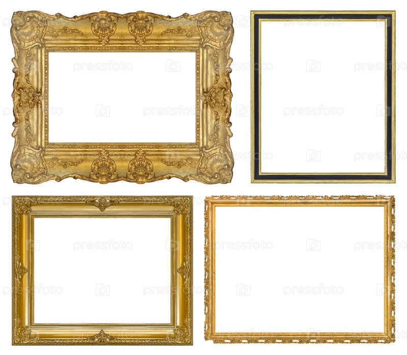Набор золотых рамок для картин, зеркал или фотографий, изолированных на белом фоне