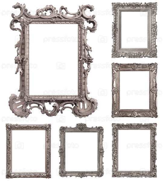 Набор серебряных рамок для картин, зеркал или фотографий изолированный на белом фоне