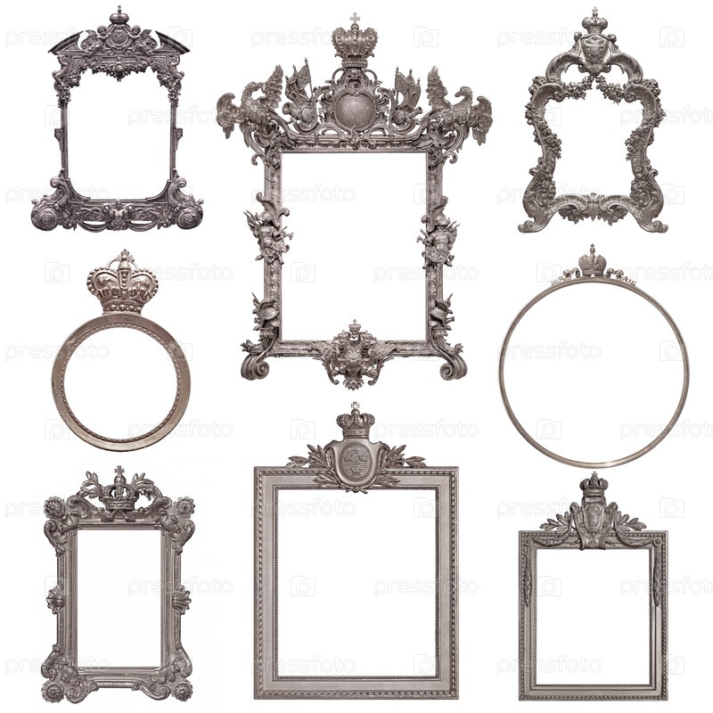 Набор серебряных рамок для картин, зеркал или фотографий изолированный на белом фоне