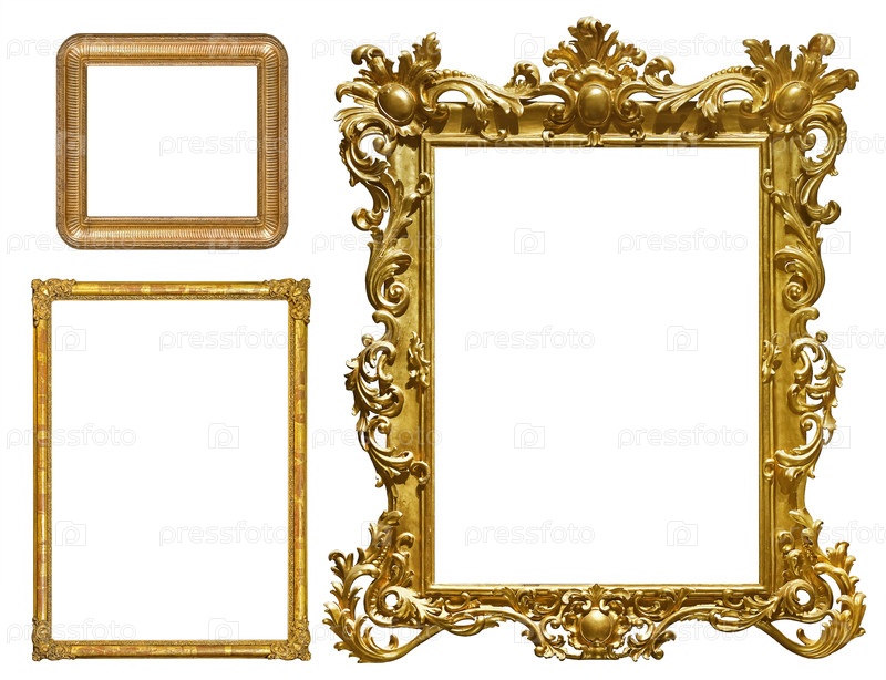 Набор золотых рамок для картин, зеркал или фотографий, изолированных на белом фоне