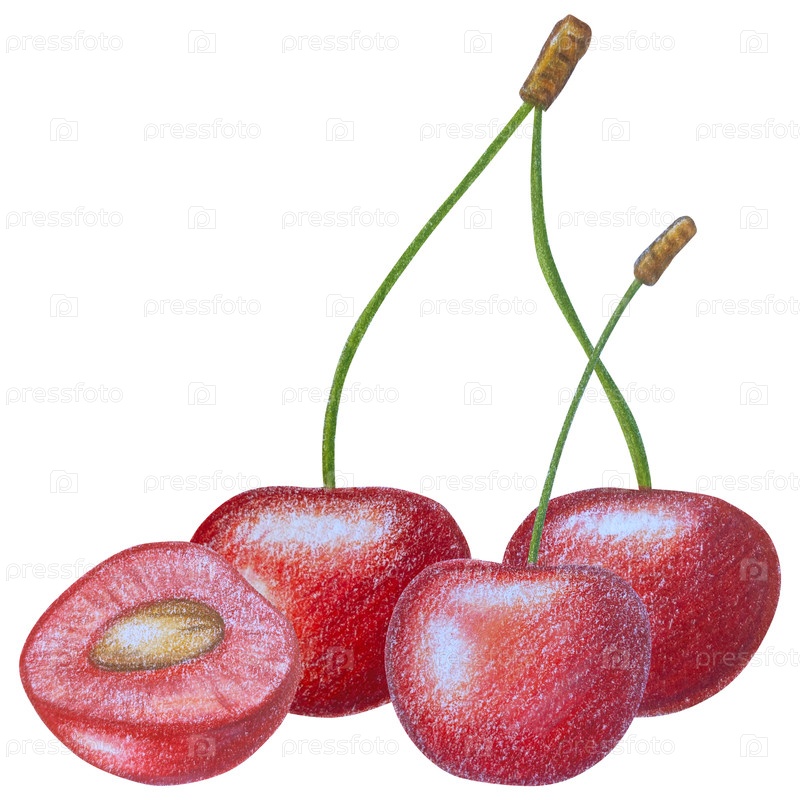 Клипарт с вишневыми фруктами. Ручно нарисованные свежие спелые ягоды. Летний цветок сада, сочный десерт, урожай фермы. Набор ботанических иллюстраций акварели для дизайна этикетки, меню, логотипа, приглашения или упаковки