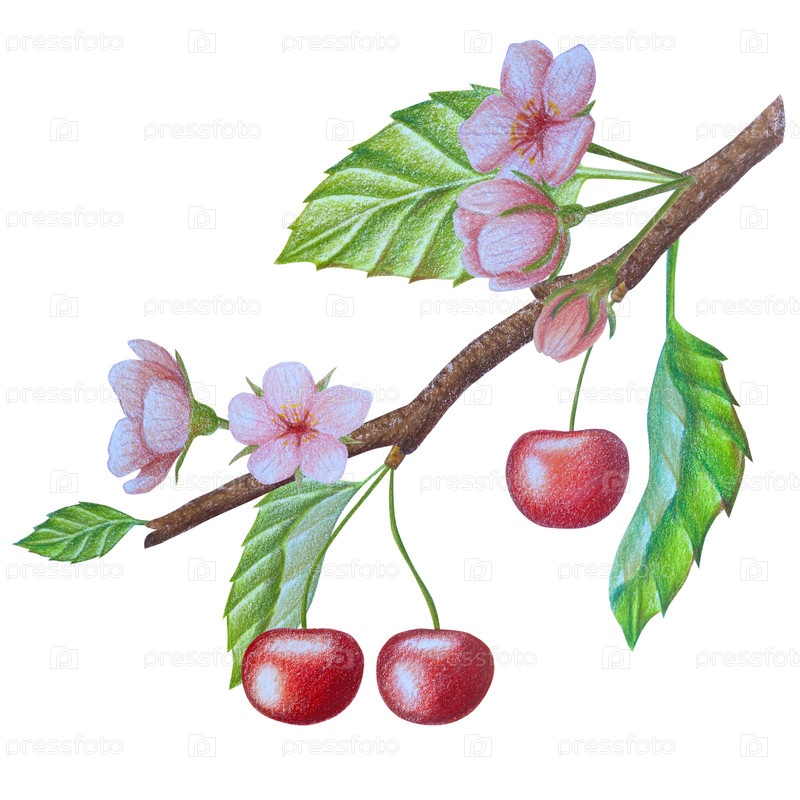 Клипарт с вишневыми фруктами. Ручно нарисованные свежие спелые ягоды. Летний цветок сада, сочный десерт, урожай фермы. Набор ботанических иллюстраций акварели для дизайна этикетки, меню, логотипа, приглашения или упаковки