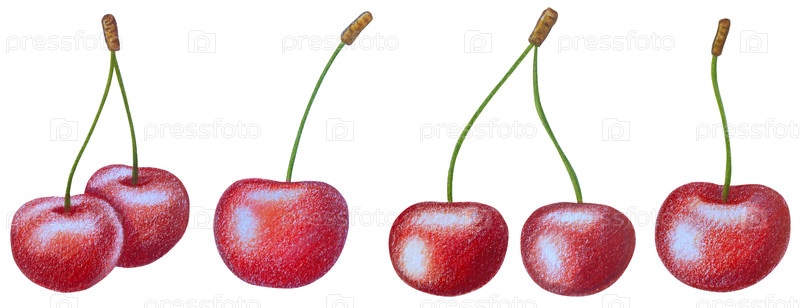 Клипарт с вишневыми фруктами. Ручно нарисованные свежие спелые ягоды. Летний цветок сада, сочный десерт, урожай фермы. Набор ботанических иллюстраций акварели для дизайна этикетки, меню, логотипа, приглашения или упаковки