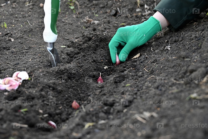 Руки с зелеными перчатками тщательно помещают зубчики чеснока в подготовленную почву в саду.Погода ясная, что указывает на то, что это продуктивное время для посадки весной