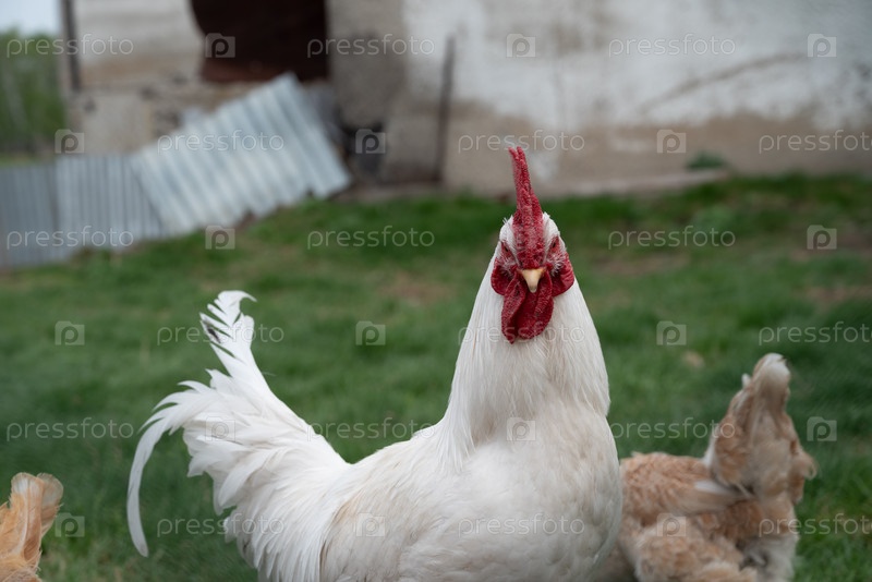 Петух с красным клювом и белыми перьями смотрит в камеру