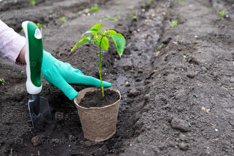 Женщина-фермерка руками сажает до земли рассады в овощном саду