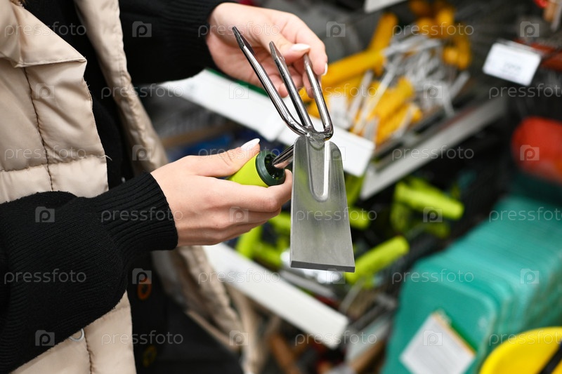 Человек осматривает садовый нож в магазине товаров для дома днем