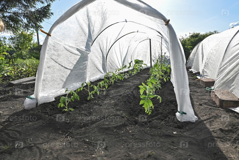 Молодые растения томатов растут в аккуратные ряды, покрытые белой защитной тканью для защиты от холода на сельском заднем дворе весеннего дня
