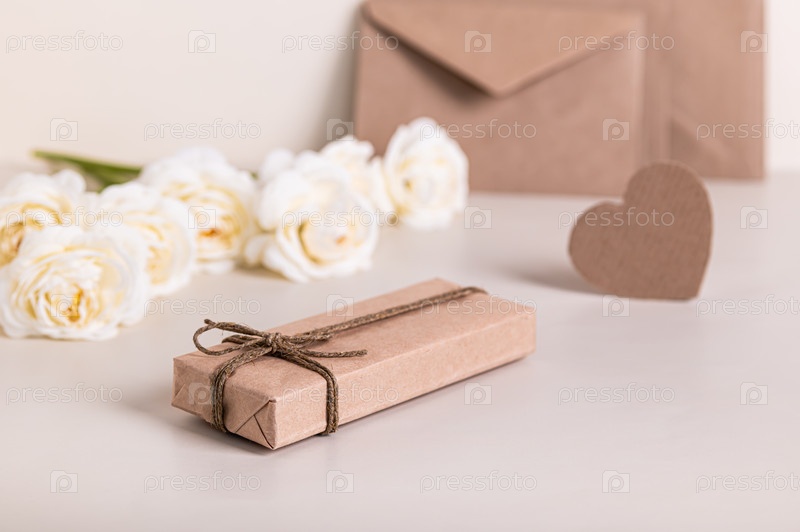 Подарок в ремесленной упаковке, сердце, конверты и цветы на столе