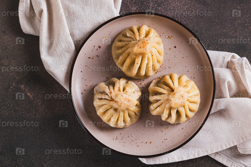 Близкий снимок порции кипяченого грузинского хинкали на тарелке на столе