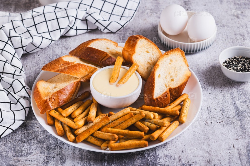 Голландский соус с хлебными палочками и тостом на тарелке за столом