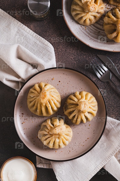 Традиционные грузинские сочные пельмени хинкали на тарелке и вертикальный вид
