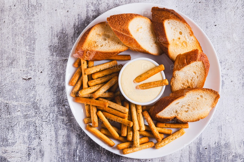 Близкий снимок яичного соуса в миске, хлебных палочек и хлеба на тарелке на столе