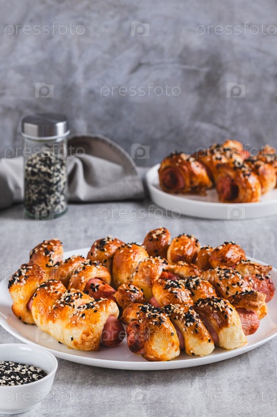 Сосиски, испеченные в пуфлиной выпечке с кунжутными семенами на тарелке на столе вертикальный вид