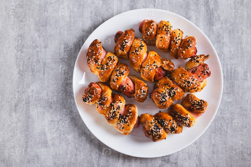 Близкий снимок сосисок, испеченных в пуф-печенье с кунжутными семенами на тарелке на столе