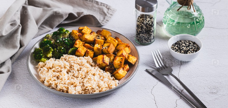 Коричневый рис, брокколи и выпеченное тофу на тарелке за столом