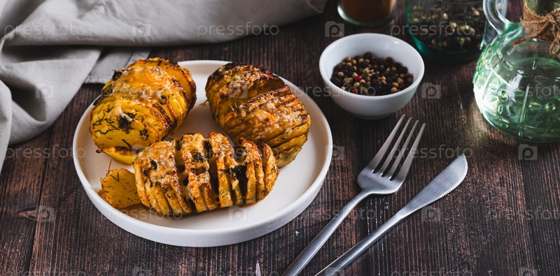 Выпеченные картофель Хасселбек с сыром, чесноком и травами на тарелке на веб-баннере стола