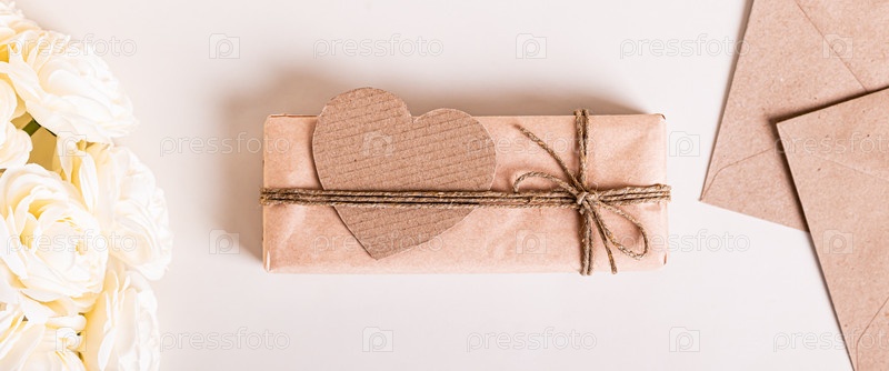 Подарочная коробка, сердце и розы на День матери на столе сверху смотреть веб-баннер