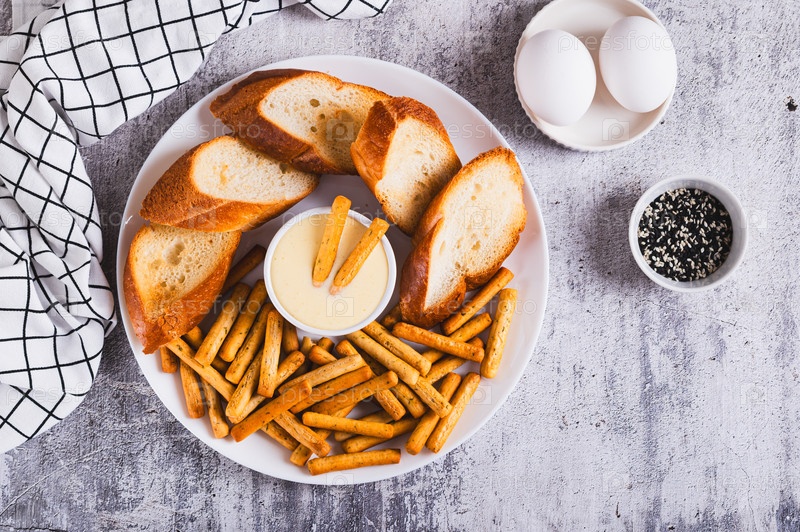 Яичный соус в миске, хлебные палочки и хлеб на тарелке на столе