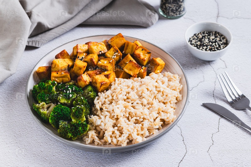 Тарелка с рисом, жареным тофу и брокколи на столе