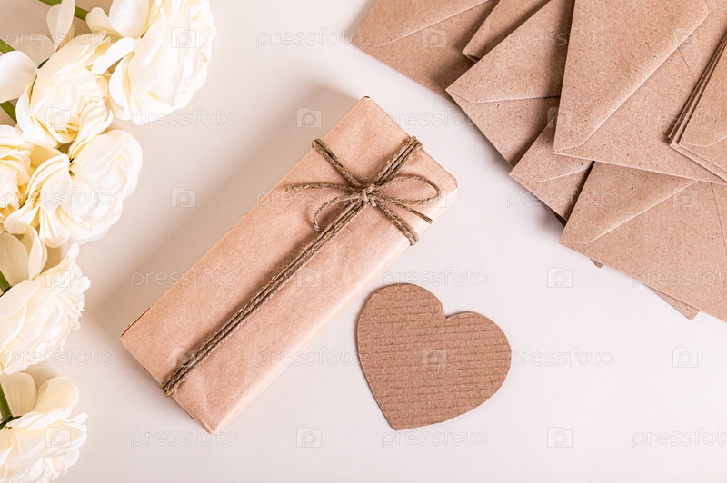Подарок в ремесленной упаковке, сердце, конверты и цветы на столе
