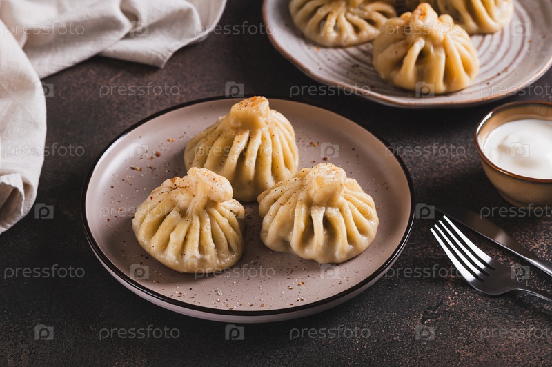 Традиционные грузинские сочные пельмени хинкали на тарелке за столом