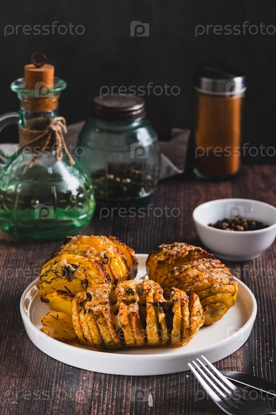 Выпеченные картофель Хасселбек с сыром, чесноком и травами на тарелке на столе вертикальный вид