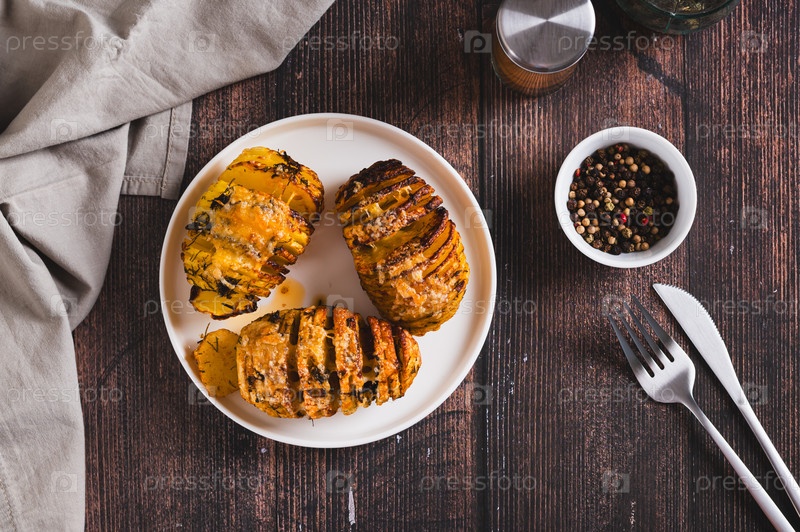 Выпеченные картофель Хасселбек с сыром, чесноком и травами на тарелке на столе
