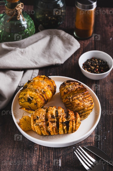 Хрустящие запеченные картофели аккордеон с сыром и травами на тарелке на столе вертикальный вид