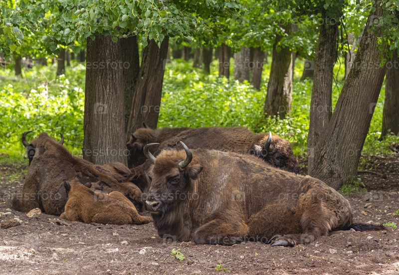 Безмятежные зубры, отдыхающий под деревьями на фоне лесного пейзажа в Приокско-Террасном заповеднике в Серпуховском районе Московской области