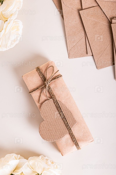 Подарочная коробка, сердце и розы на День матери на столе с вертикальным видом