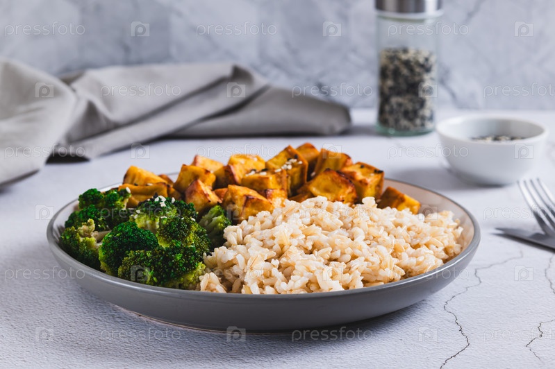 Коричневый рис, брокколи и выпеченное тофу на тарелке на столе