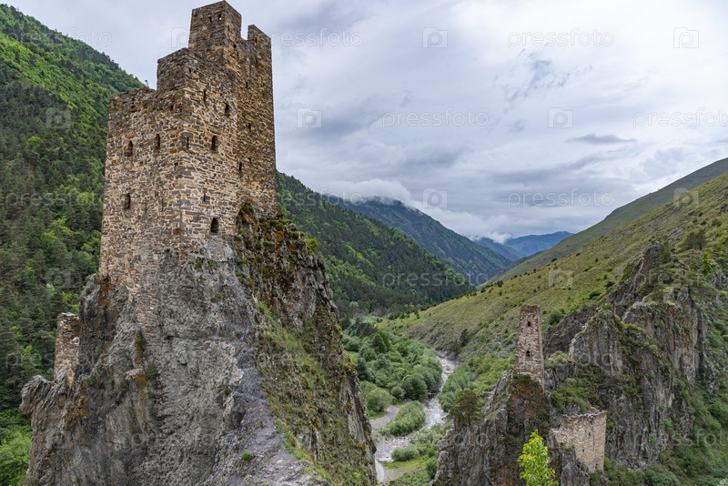 Древние ингушские башни в горах на фоне облачного неба. Вовнушки, Ингушетия, Россия