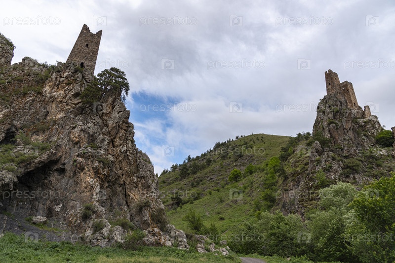 Древние ингушские башни в горах на фоне облачного неба. Вовнушки, Ингушетия, Россия