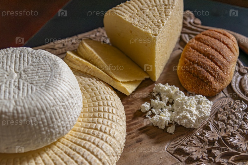 Визуально привлекательная композиция из различных сыров ручной работы, выложенных на деревянном блюде красивой работы. На сцене представлены различные виды сыра, в том числе круглый белый сыр, сыр в желтых кубиках большего размера, ломтики сыра и свежая с