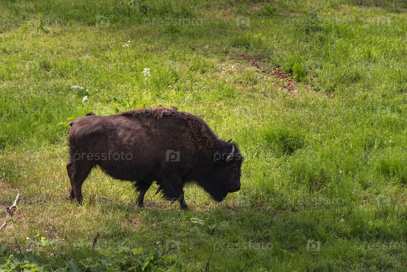 Безмятежный зубр пасется на лесной поляне в Приокско-Террасном заповеднике Серпуховского района Московской области