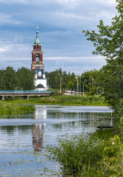 Старая церковь и колокольня в Юрьев-Польском отражается в речной глади под синим небом