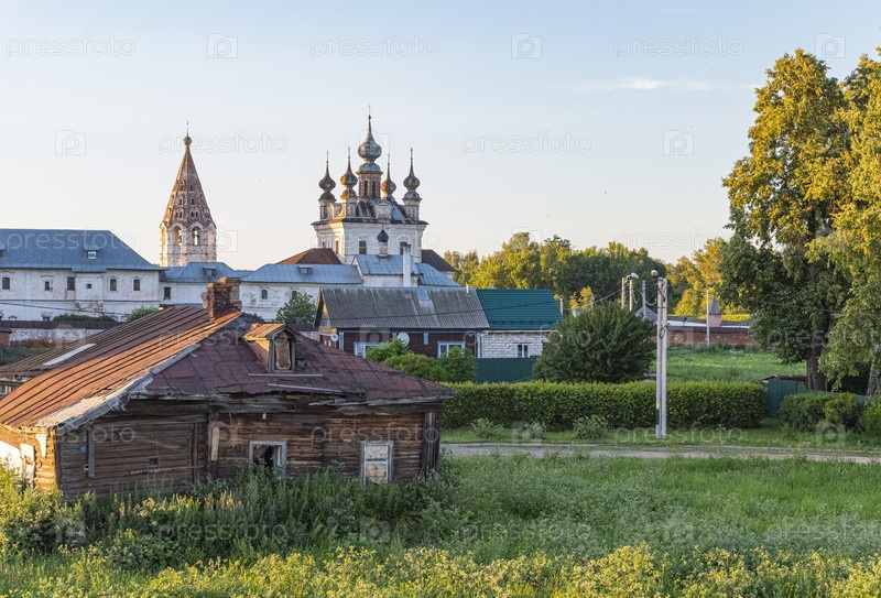 Панорама исторического центра Юрьев-Польского с древней белокаменной церковью и заброшенным домом