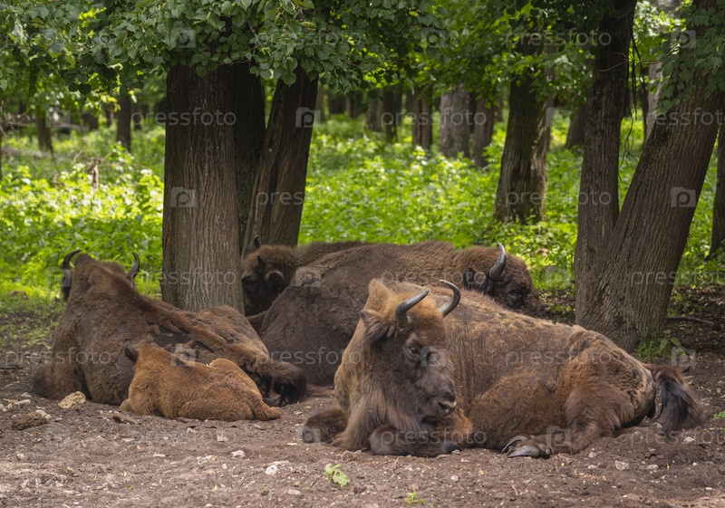 Безмятежные зубры, отдыхающий под деревьями на фоне лесного пейзажа в Приокско-Террасном заповеднике в Серпуховском районе Московской области