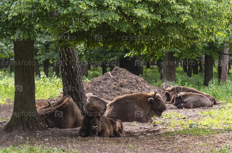Безмятежные зубры, отдыхающий под деревьями на фоне лесного пейзажа в Приокско-Террасном заповеднике в Серпуховском районе Московской области