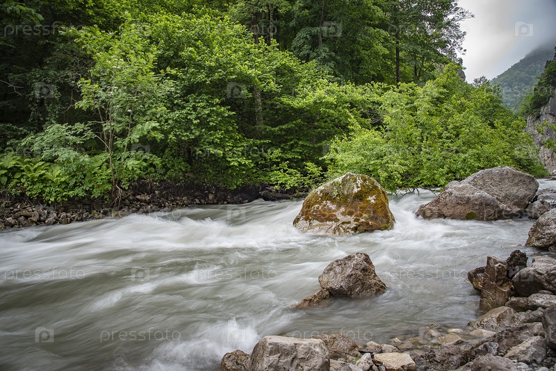 Бурная горная река Сунжа в скалистом ущелье в Ингушетии