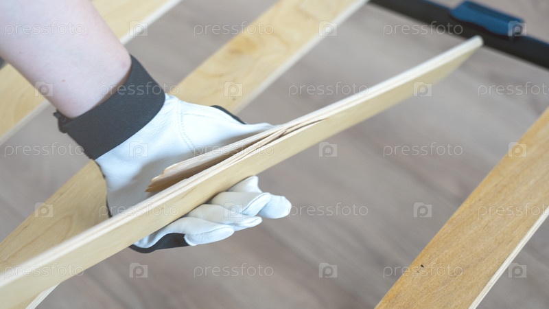 Сломанная ламелла на кровати.Мастер меняет ламельку на кровати.Сломанная ламелька в ближайшем плане у кровати