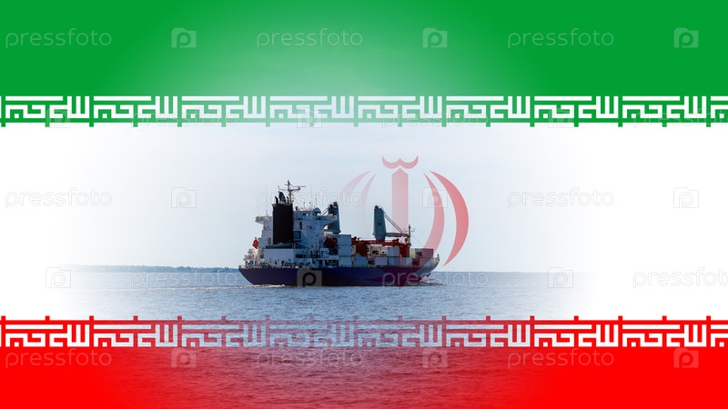 Контейнерный корабль в море на фоне иранского флага, концепция логистики и глобальной торговли, Иранское грузовое судно