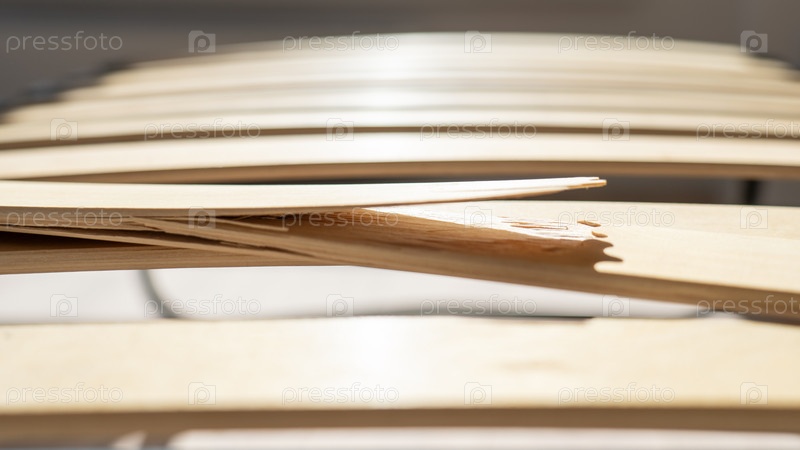 Сломанная ломелла вблизи кровати. сломленные деревянные лестницы на постели. сломленная ламелла древесная доска спальной мебели деталь элемента ремонта